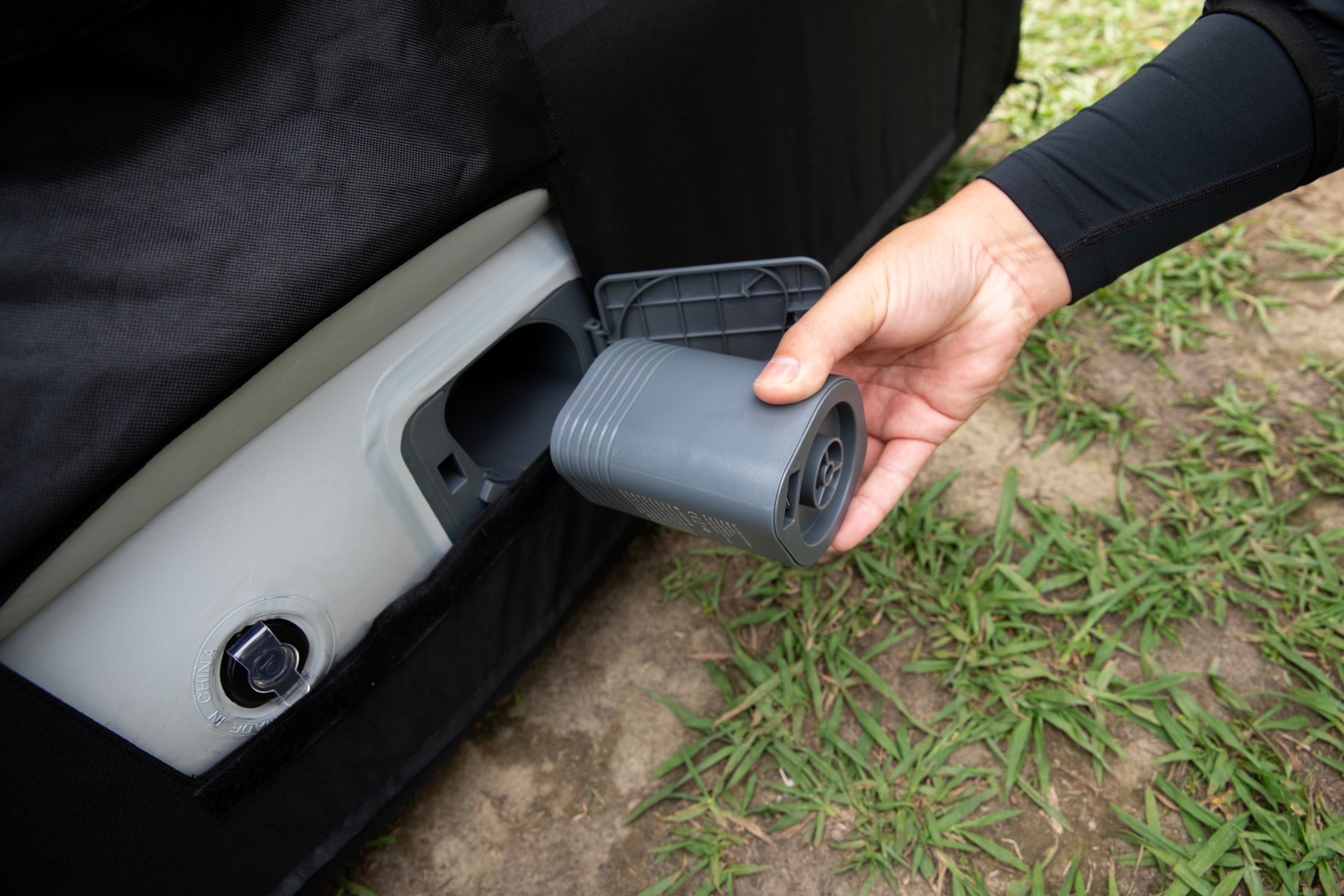 上段はポンプを取り外し、付属アタッチメントを接続して空気を入れる仕様です。